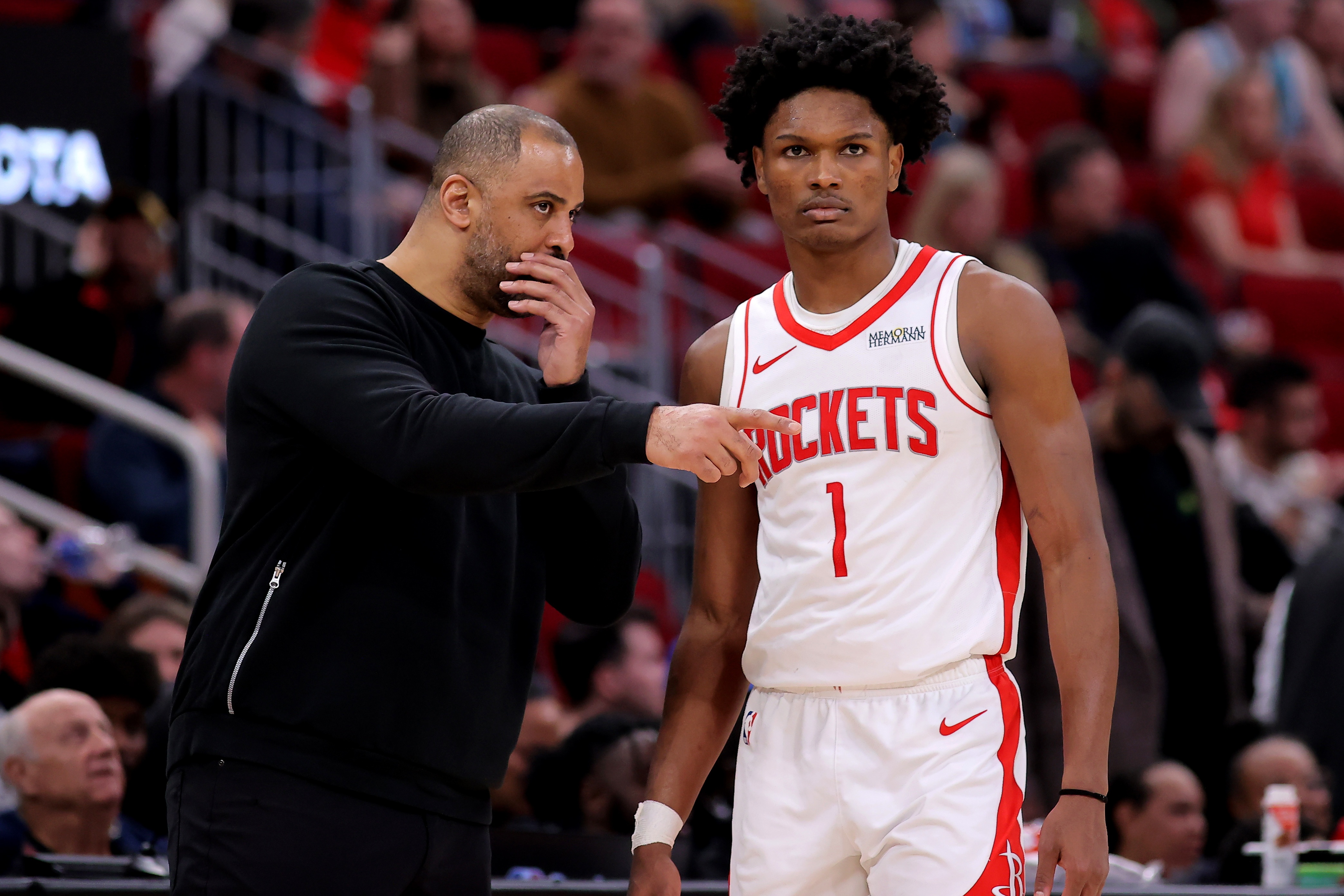 火箭暂时的阵容配置只能把杜兰特当进攻发起点用,原因大家都懂,范弗里特赛季报销,火箭没有首发级别控卫能让杜兰特在甜点位接球。换言之,火箭依赖杜兰特给队友创造空位得分机会,球队不具备让杜兰特扮演终结点的发牌配置